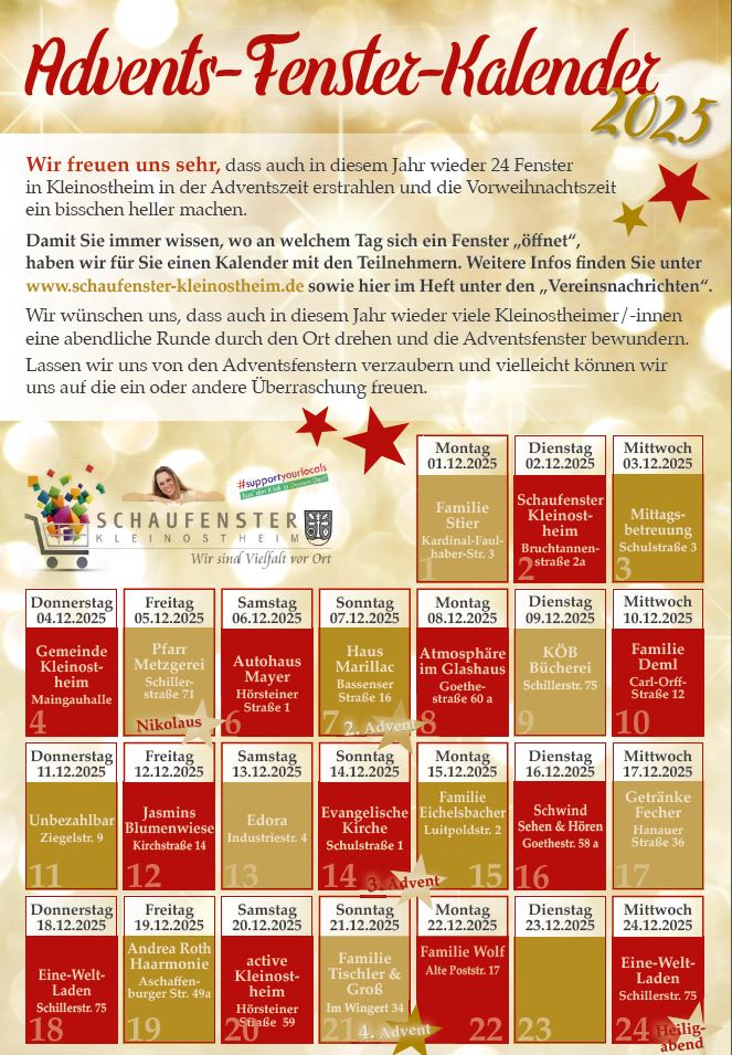 Di., 02.12., Schaufenster Kleinostheim, Bruchtannenstraße 2a: ab 18.00 Uhr Glühwein und Flammkuchen. Die Mitglieder des Schaufenster stellen sich vor