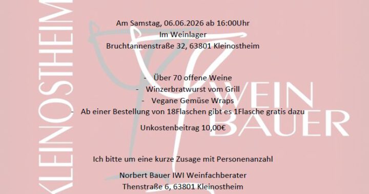 Am Samstag, 06.06.2026 ab 16Uhr findet im Weinlager Bruchtannenstraße 32, 63801 Kleinostheim die traditionelle Weinprobe statt